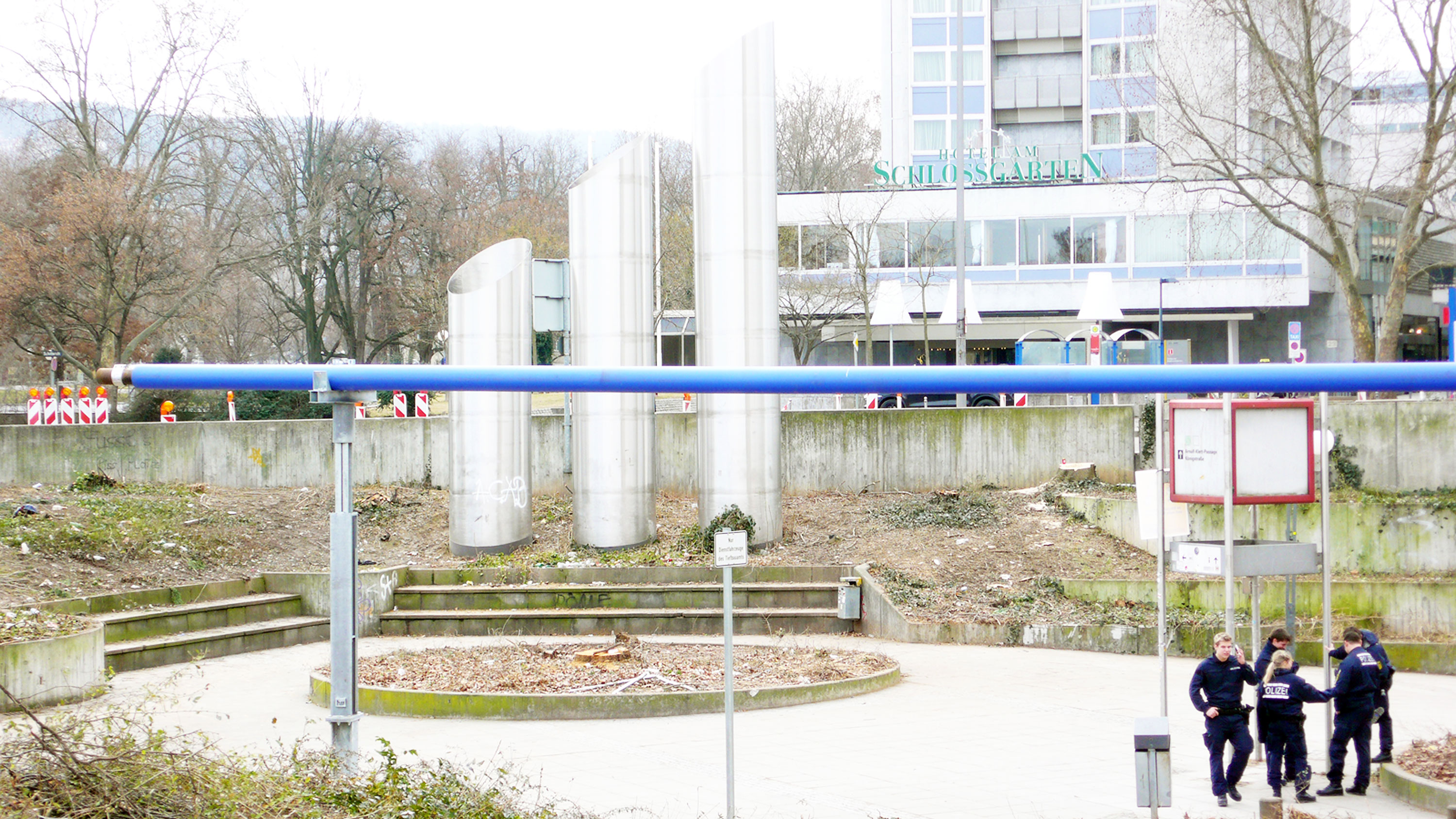 Ich erkläre die blaue Rohrinstallation der Stuttgart-21-Baustelle zu meiner Großskulptur, und schlage den Verantwortlichen im S-21 Kommunikationsbüro und im Stuttgarter Kulturamt vor, diese positive und überraschende Synergien erzeugende Neudefinition zu übernehmen. Eine Unterschriftensammlung unterstützt die Okkupation und eine Fotoserie zeigt die stolze Künstlerin vor ihrem neuen, stets gut bewachten monumentalen Werk.