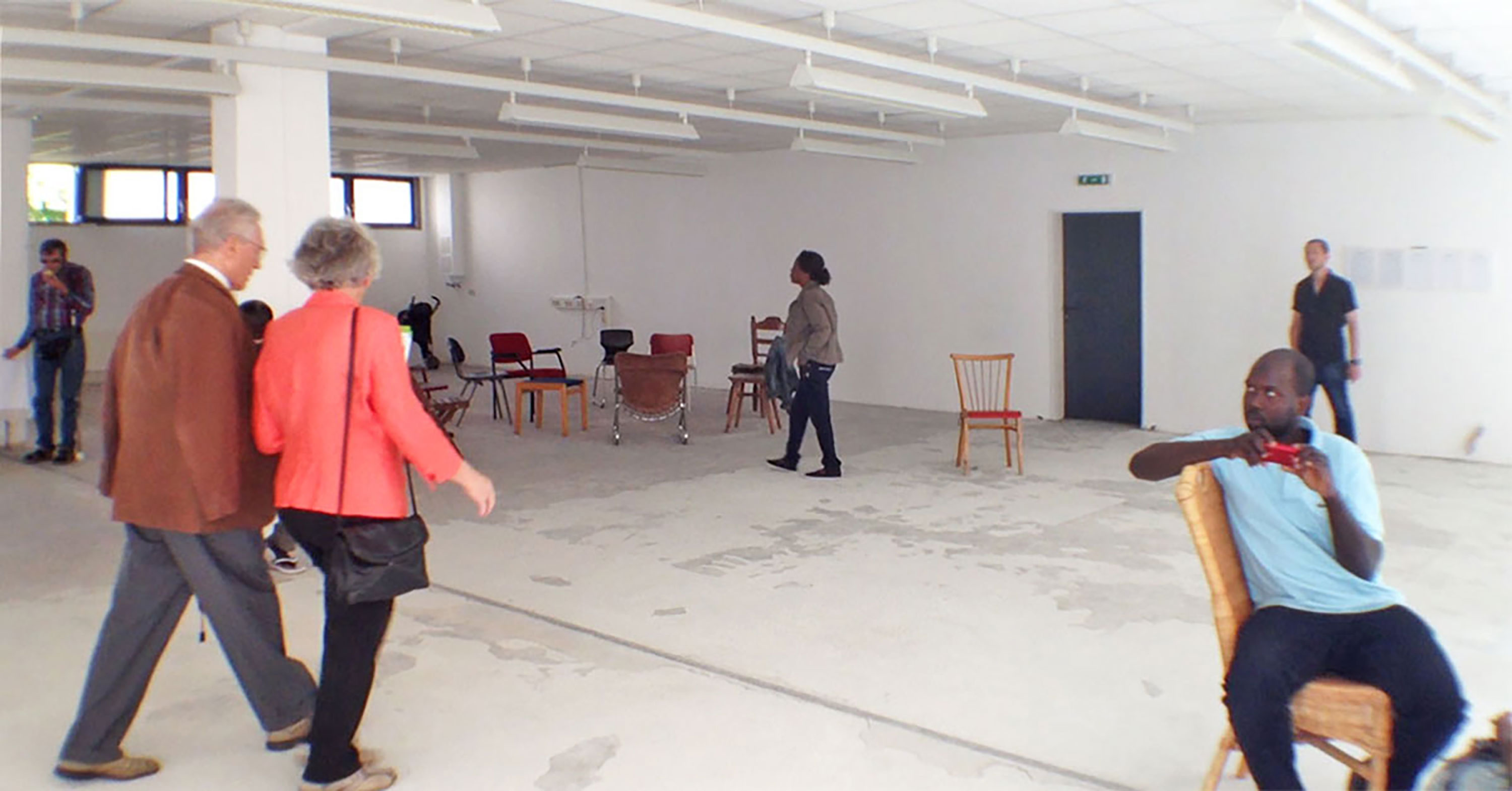 Im ca. 250 m2 großen, leeren, weiss gestrichenen ehemaligen ›Weltbild‹- Laden sitze ich und warte. Für potentielle Mitarbeiter*innen stehen 20 unterschiedliche Stühle bereit. Kurz nach 10 Uhr treffen die ersten Interessent*innen ein. Ich erkläre nochmals die Tätigkeit: eine offene Bühne, auf der jeder nach Bedarf arbeiten und seine selbst definierte Rolle entwickeln kann. Auch das Setting kann jederzeit verändert oder gestaltet werden. Meine Rolle ist passiv da zu sein, keine Impulse zu geben, zu begleiten.
